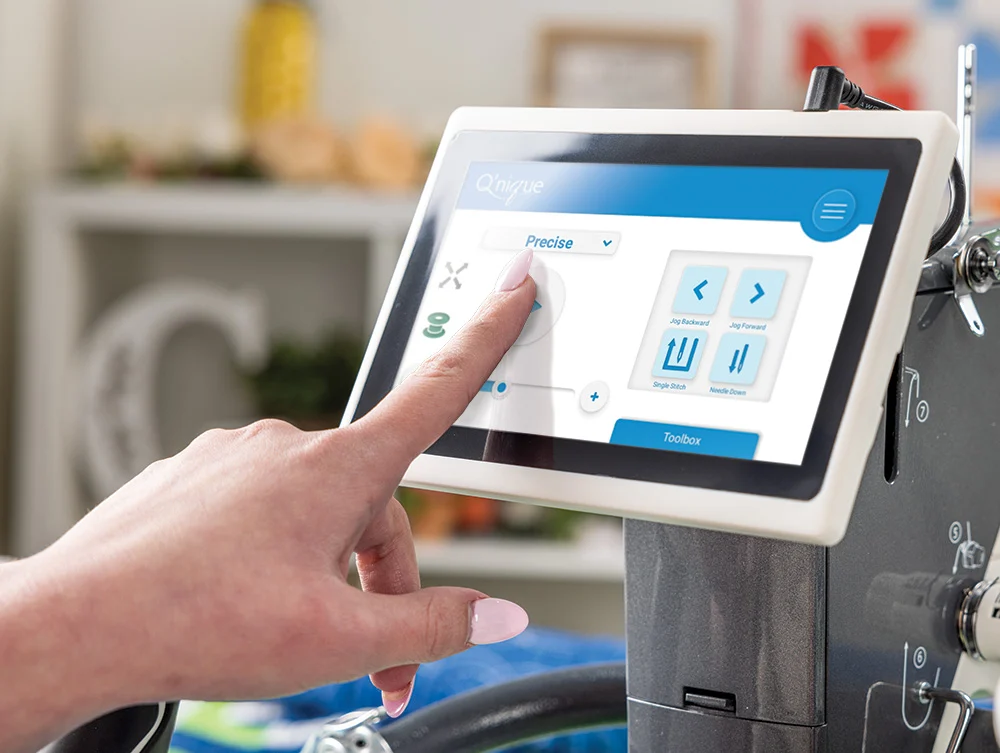 Discover innovative smart technology like a patented edge warning system to keep you inside your quilting area, or a bobbin estimator feature that tells you how much longer your bobbin will last. With a speed of up to 2,600 stitches-per-minute and built-in stitch regulation, you can quilt at any speed knowing that your stitches will be beautifully consistent. The handles of the Q’nique 19X Elite can be adjusted to the most comfortable position for you, so you can quilt for longer without any aches and pains. The soft, ergonomic handles are designed to follow the contours and curves of your hand, relieving stress in your hands and wrists so you can quilt comfortably.