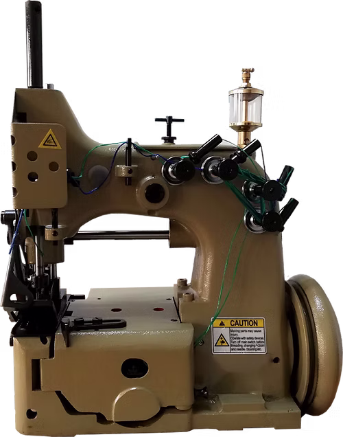 DOUBLE NEEDLE, FOUR THREAD HEAVY DUTY FIBC (flexible intermediate bulk container) AND GEOTEXTILE SEWING MACHINE WITH FILLER CORD GUIDE ON TOP AND BOTTOM.